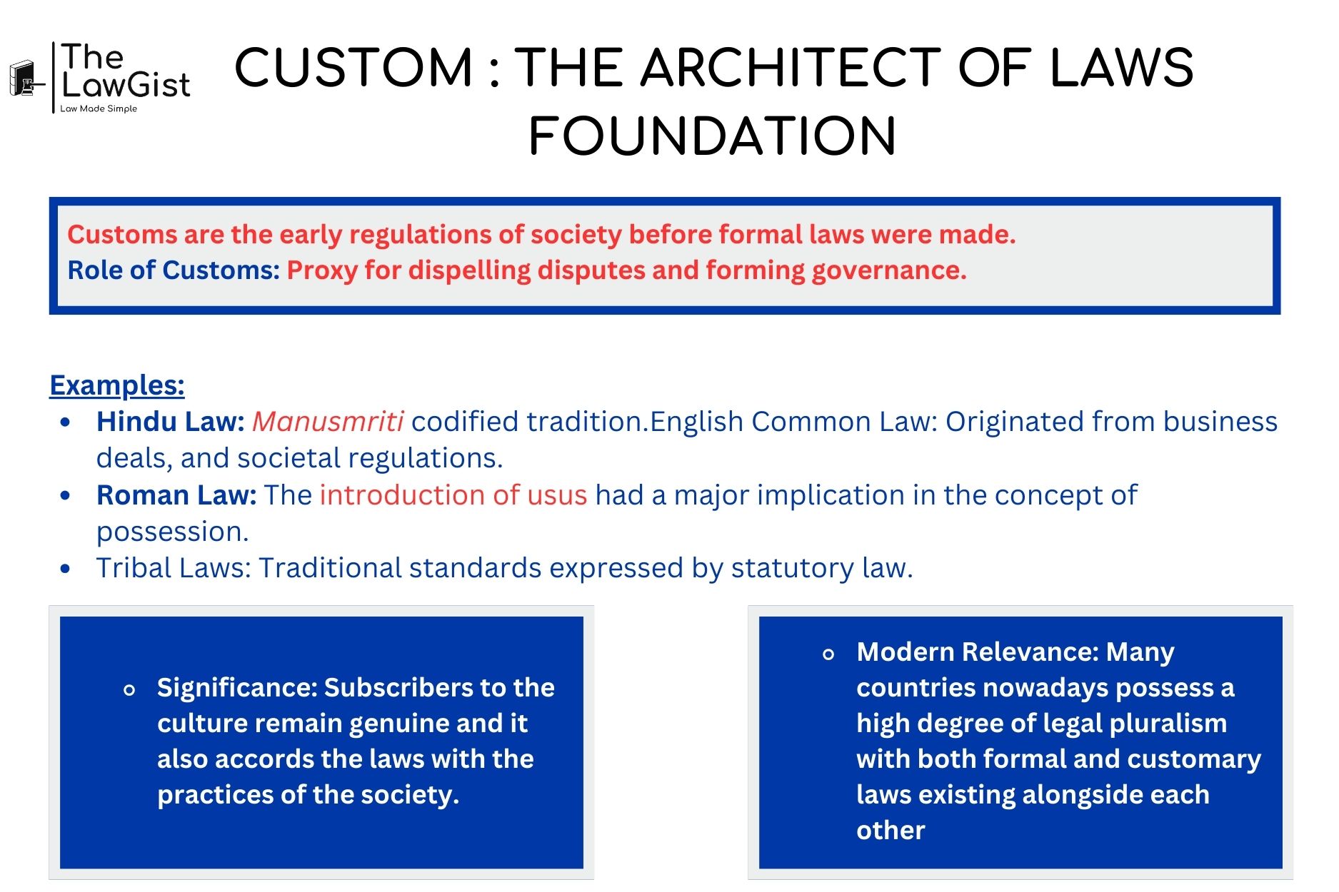 Customs are essential for drafting law. Customs behave as the balance between both Societal practices and formal justiciable structure. They have influenced legal systems like English common law and mercantile law. Roman law has also focused on customs which contain the core value of the culture and tradition of society and also encourage laws that promote peaceful coexistence among people, which is the primary objective of framing laws.