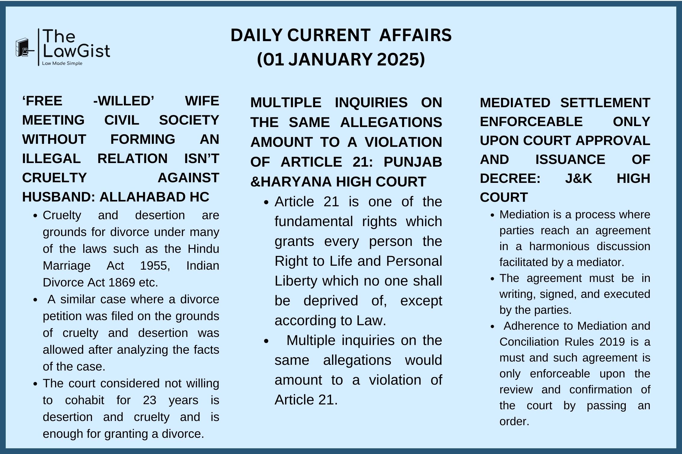 A bench comprising Justice Saumitra Dayal Singh and Justice Donadi Ramesh ruled that a woman going out on her own and meeting people without engaging in an illegal relation would not amount to cruelty. However refusing to cohabit with the husband and denying to keep alive the marital relationship would amount to cruelty against the Husband. These observations allowed a divorce petition on the basis of desertion and cruelty. The court noted that 23 year duration of living away from each other can be considered as desertion and is sufficient for dissolution of marriage.
