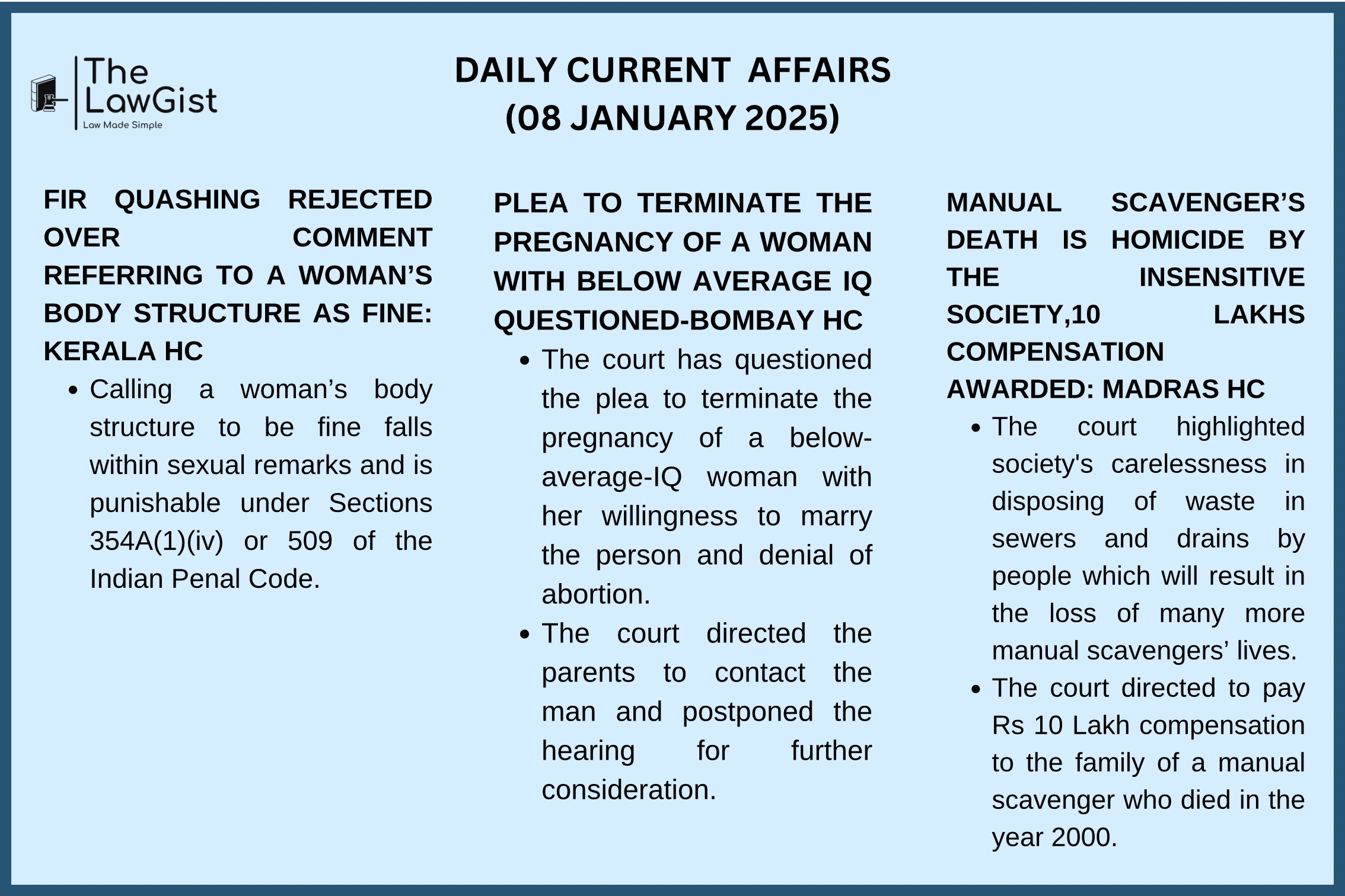 The court ordered the Chennai Metropolitan Water Supply & Sewage Board to provide Rs 10 Lakh compensation to the family of a manual scavenger who died while doing the work in 2000. The court emphasized that carelessly disposing of waste in sewers and drains by people will cost many more lives which is nothing short of a homicide by the insensitive society.