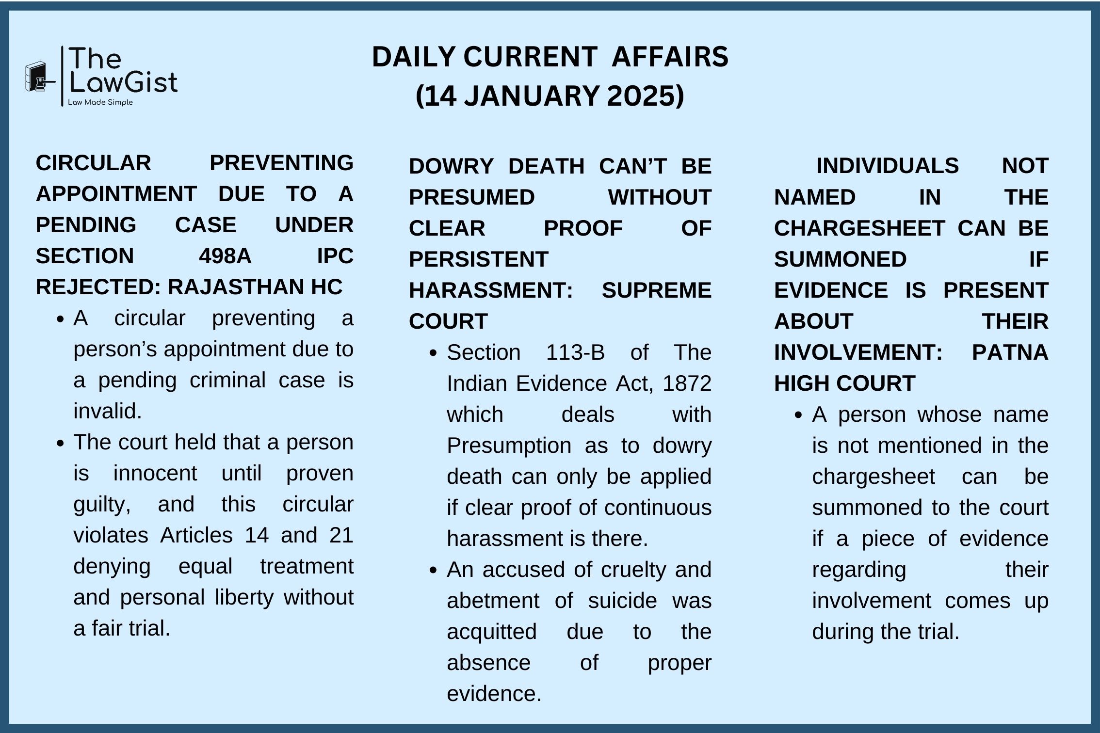 The court has set aside the order that barred a person’s appointment to a lower division clerk post due to a pending case against him under Section 498A(cruelty) filed by his wife. It observed that the accused is presumed innocent until proven guilty, and the enforcement of such an order would be violative of rights guaranteed under Articles 14 and 21.