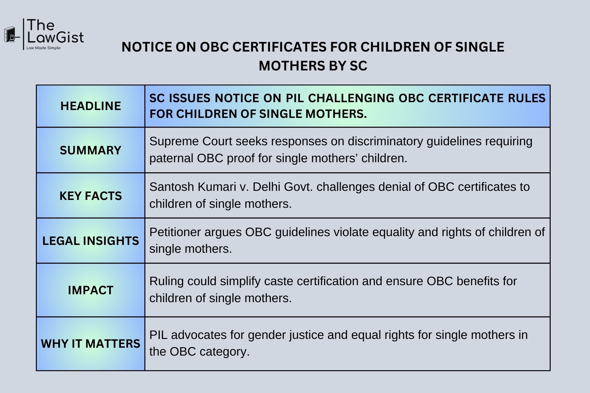 The PIL shows gender justice and equal rights for single mothers in the OBC category, making sure their children are not deprived of opportunities due to these certification problems.
