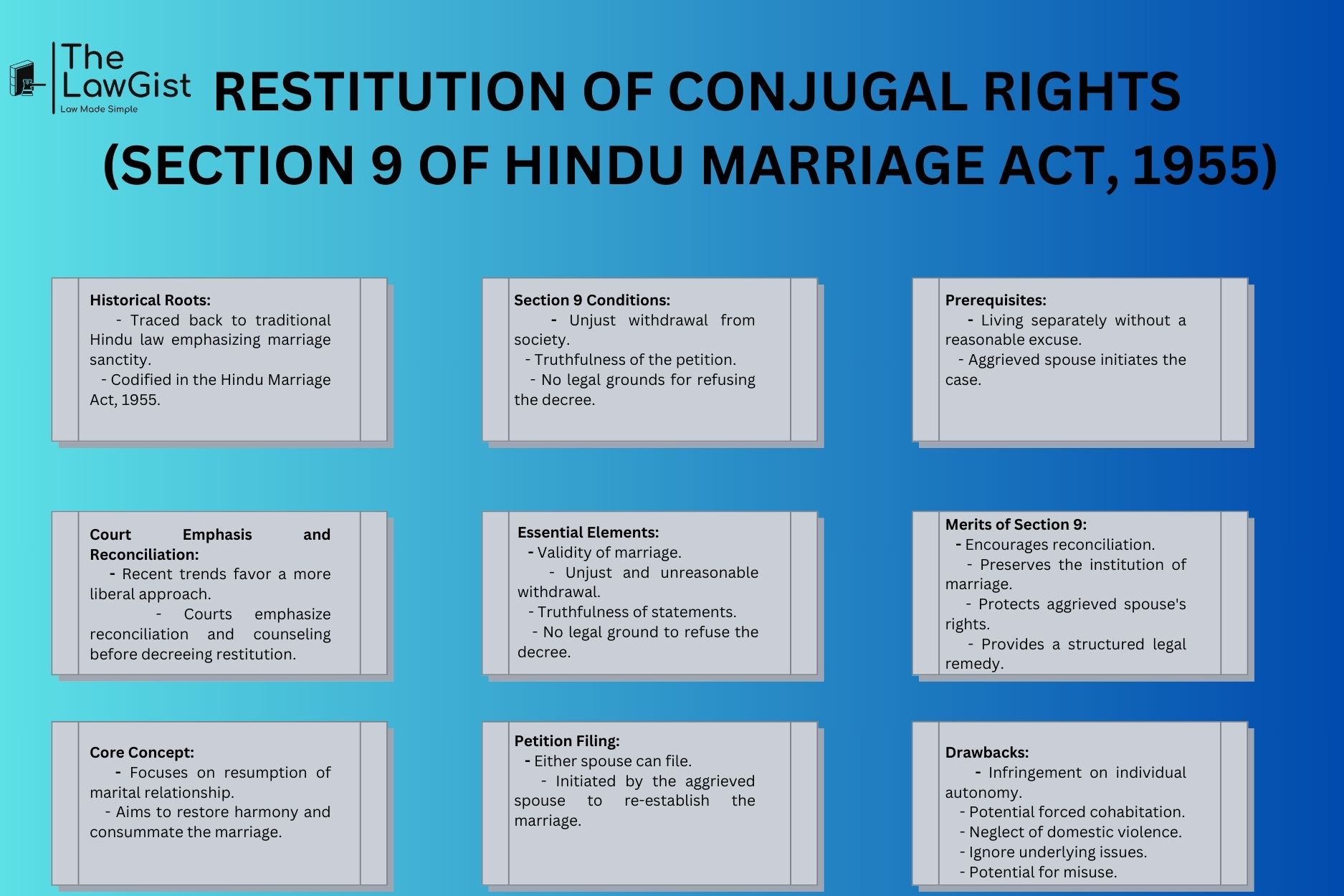 Section 9 of the Hindu Marriage Act, 1955, delves into the intricate realm of Restitution Of Conjugal Rights. This legal provision empowers an aggrieved spouse to seek court intervention when the other has withdrawn from the marital union without a reasonable excuse. While aiming to preserve the sanctity of marriage, Section 9 has been both applauded for its intent and criticized for its potential infringement on individual rights. This analysis scrutinizes the historical context, legal intricacies, and societal implications surrounding Section 9.