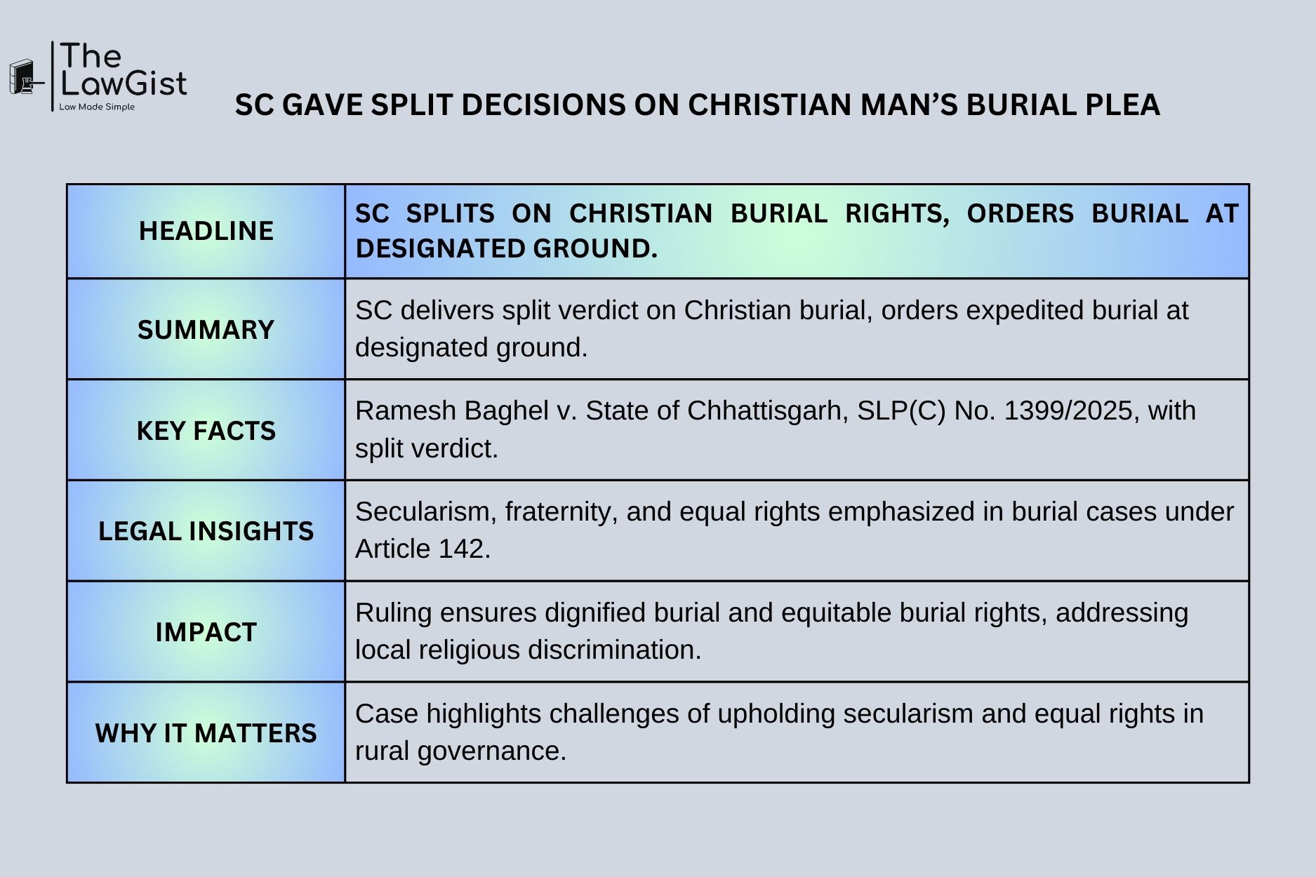 The Supreme Court of India gave split decision on Christian Burial Rights and ordered burial at specified ground for speedy resolution.